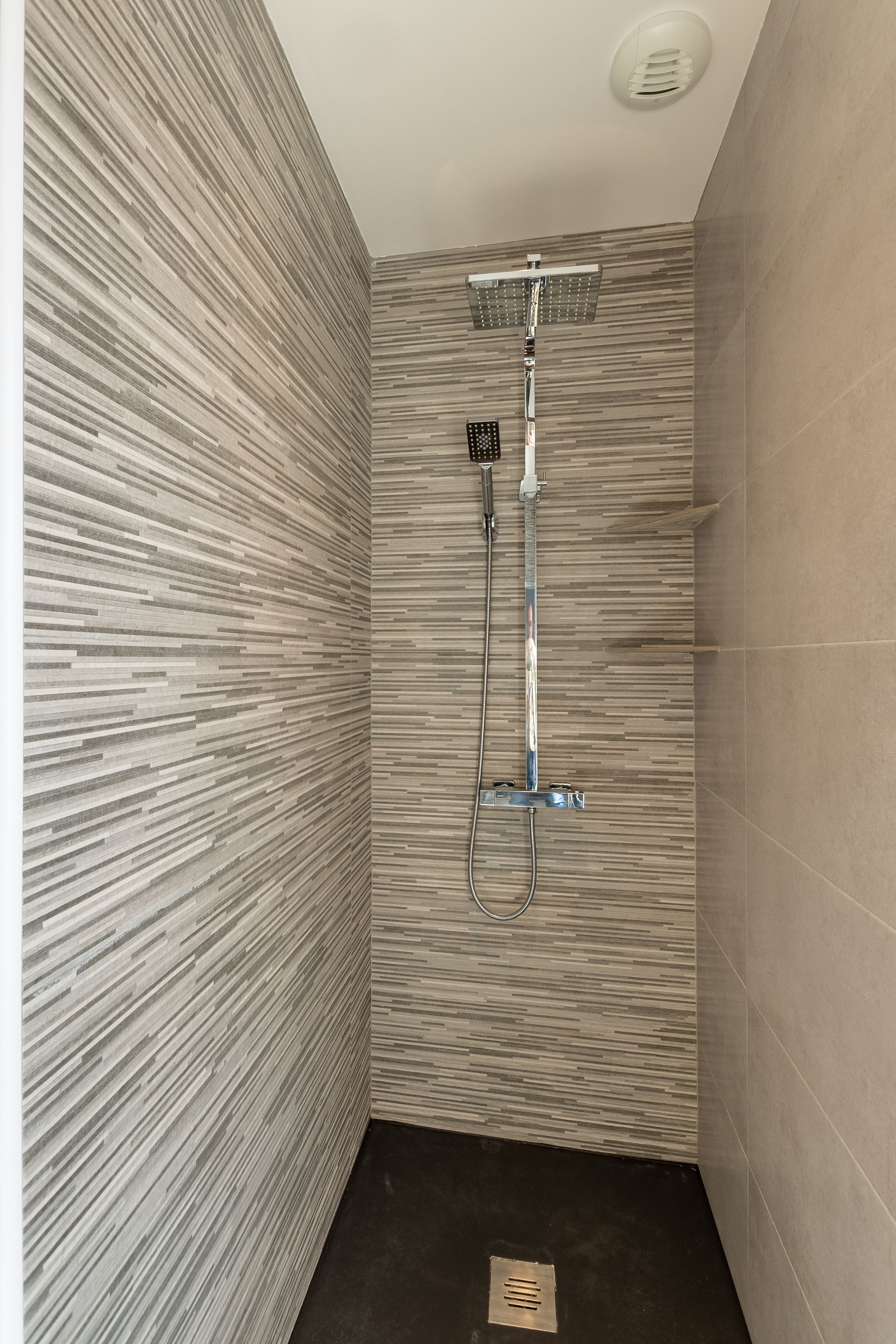 Douche italienne, double lavabo, sèche-serviette chauffant, sèche-cheveux et toilettes.