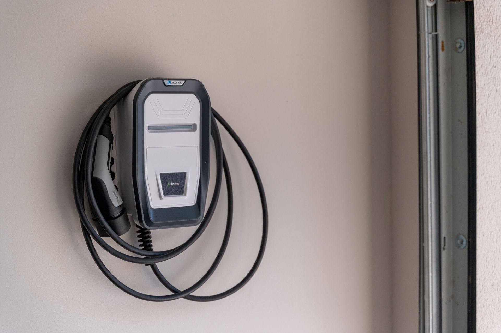 lave-linge, sèche-linge, garage pour un véhicule avec chargeur voiture électrique.
